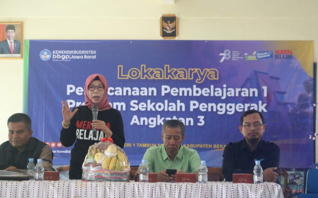 Sabtu, 26 Agustus 2023 – Kepala BBPMP Provinsi Jawa Barat menghadiri Lokakarya Perencanaan Pembelajaran 1 Program Sekolah Penggerak Angkatan 3 di SMPN 1 Tambun Selatan, Kabupaten Bekasi. Lokakarya ini merupakan salah satu upaya mentransformasi sekolah di Indonesia agar mendapatkan hasil belajar di atas level yang diharapkan, lingkungan belajar yang aman, nyaman, menyenangkan dan inklusif, proses pembelajaran yang berpusat pada murid, serta refleksi diri dan pengimbasan. Salah satu upaya dalam mencapai transformasi tersebut khususnya tentang penyelenggaraan pembelajaran yang berpusat pada murid dilakukan melalui pendampingan terhadap komite pembelajaran pada setiap sekolah penggerak melalui lokakarya. Lokakarya Perencanaan Pembelajaran 1: Pembelajaran yang berpusat pada murid merupakan kegiatan yang secara khusus membahas bagaimana mewujudkan pembelajaran serta ekosistem sekolah yang berpusat/berpihak pada murid.